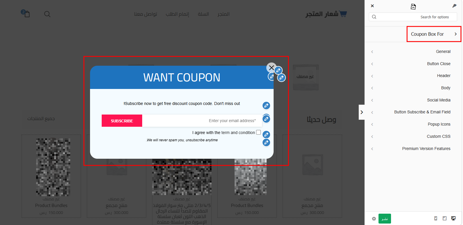 لعرض شكل صندوق الكوبون قبل أن يقوم الزائر بالاشتراك. - Show coupon after subscribing