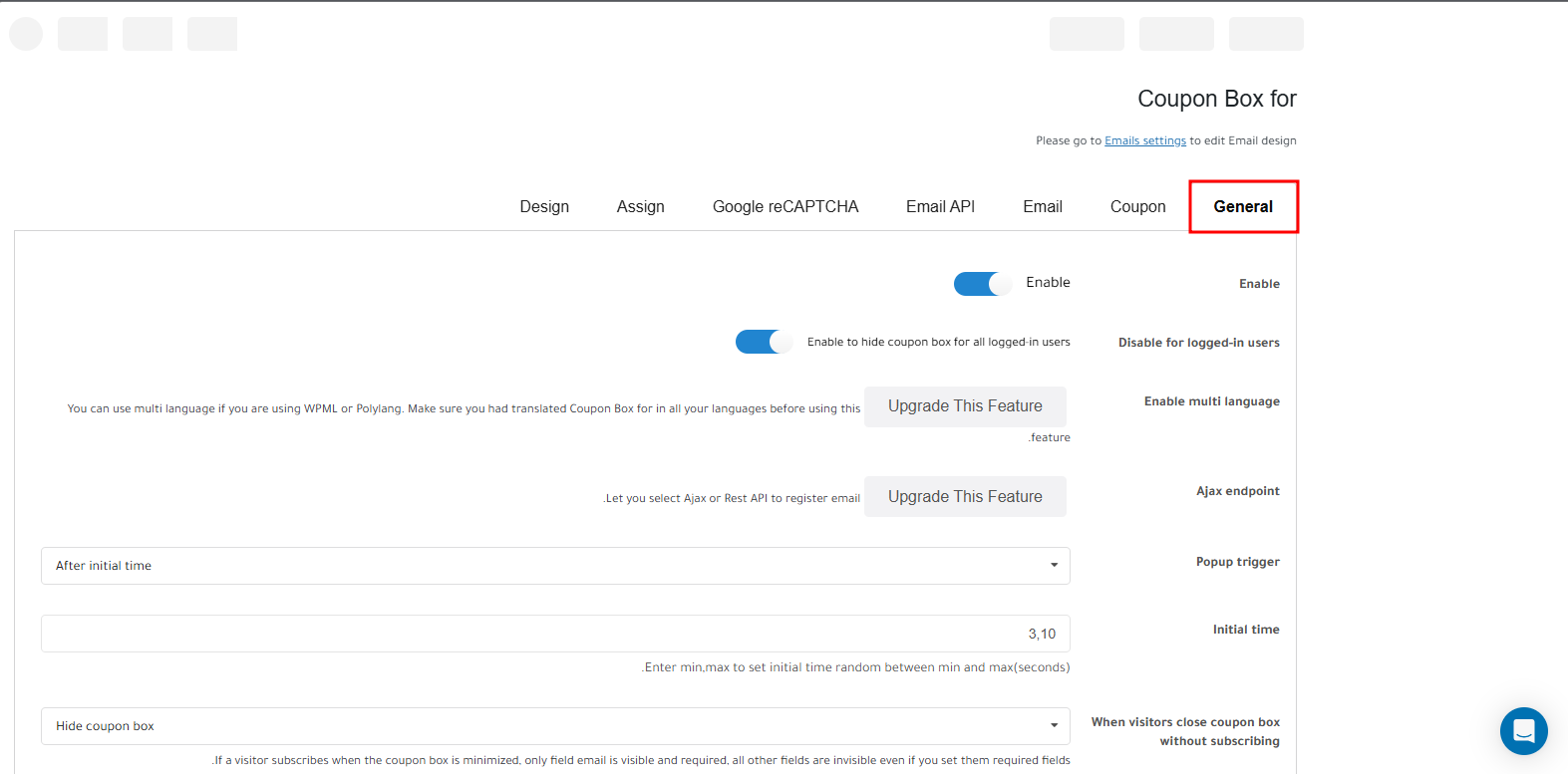 يتحكم هذا القسم في الإعدادات العامة وسلوك نافذة الكوبون.
