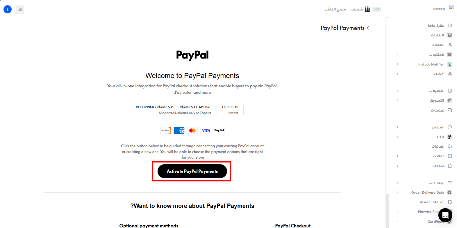 – صفحة الترحيب في إضافة PayPal Payments وتشمل: