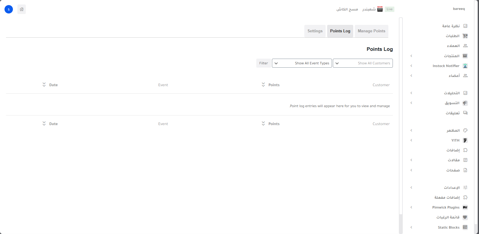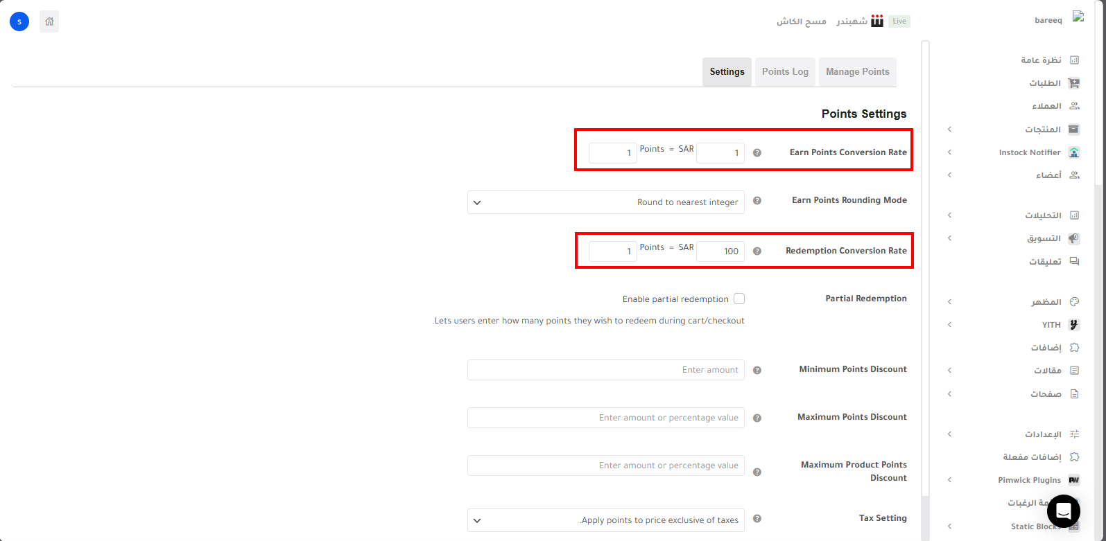 من تبويب Points Settings يمكنك ضبط نظام النقاط الخاص بمتجرك: