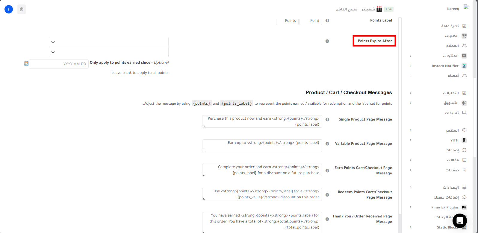 - Points Expire After تحديد مدة انتهاء صلاحية النقاط.