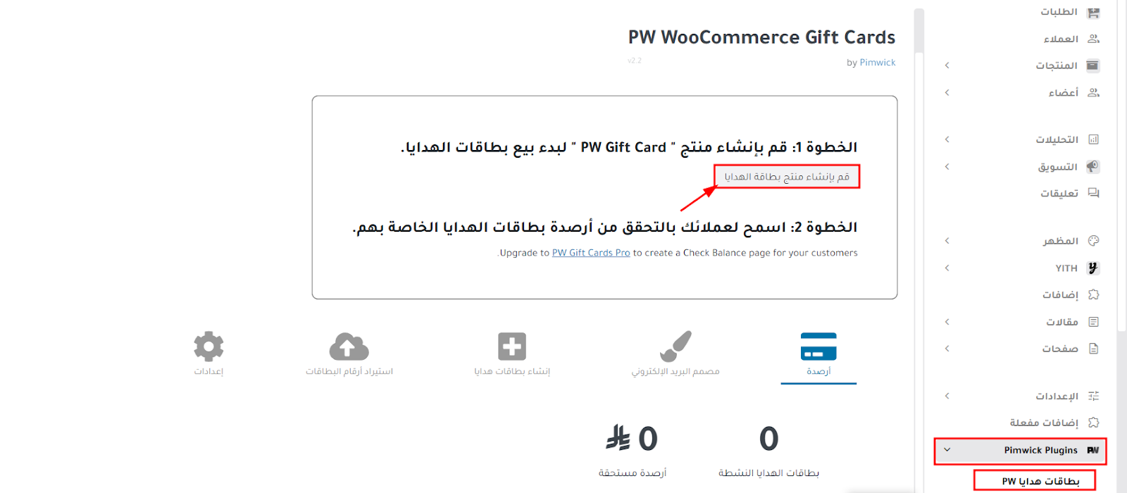 - الانتقال إلى قائمة Pimwick Plugins ثم اختيار بطاقات الهدايا.