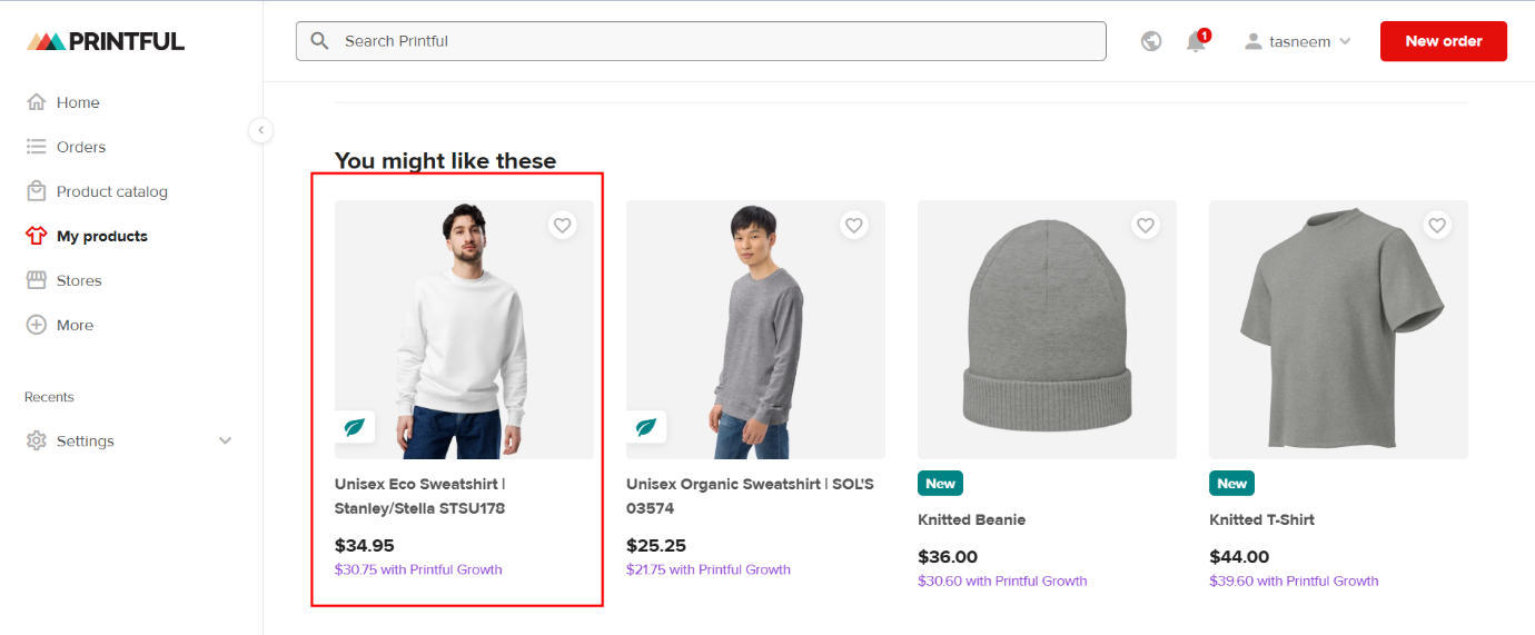 الآن أصبح المنتج مستورداً من Printful وجاهزًا للعرض والبيع في متجرك. هذه الطريقة تساعدك على بيع منتجات مخصصة بدون الحاجة لتخزين أو شحن، حيث تتولى Printful عملية الطباعة والتنفيذ والشحن مباشرة لعملائك.