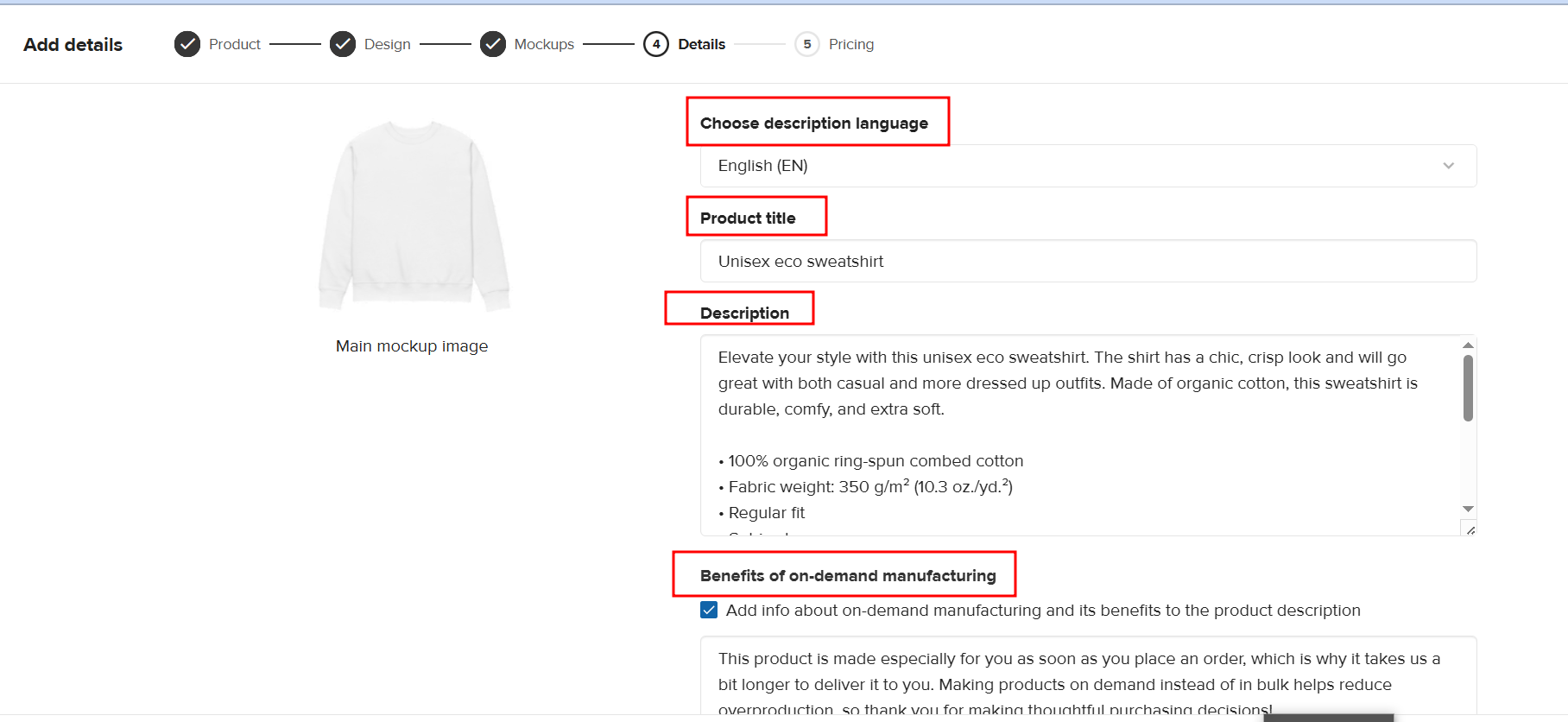 - يمكنك تفعيل خيار Benefits of on-demand manufacturing لإضافة مميزات التصنيع عند الطلب.