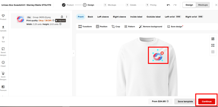 - تحديد منطقة الطباعة مثل: الأمام، الخلف، الكم الأيسر…